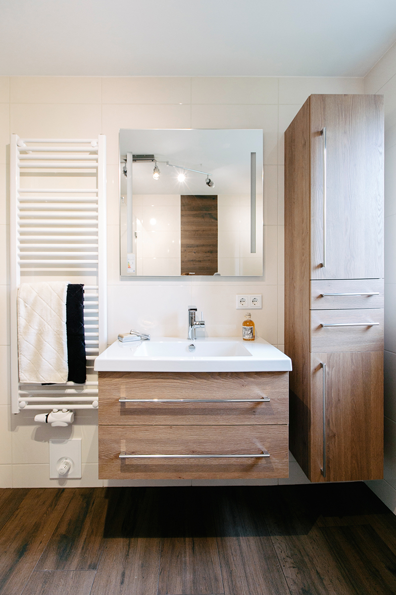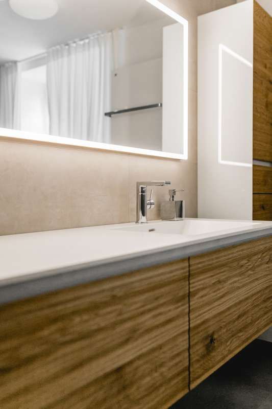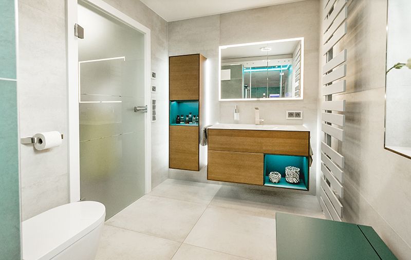 Badsanierung: Dampfdusche Repabad Infratorpanell Dornbracht Rain Villeroy Fliesen türkis Echtholz